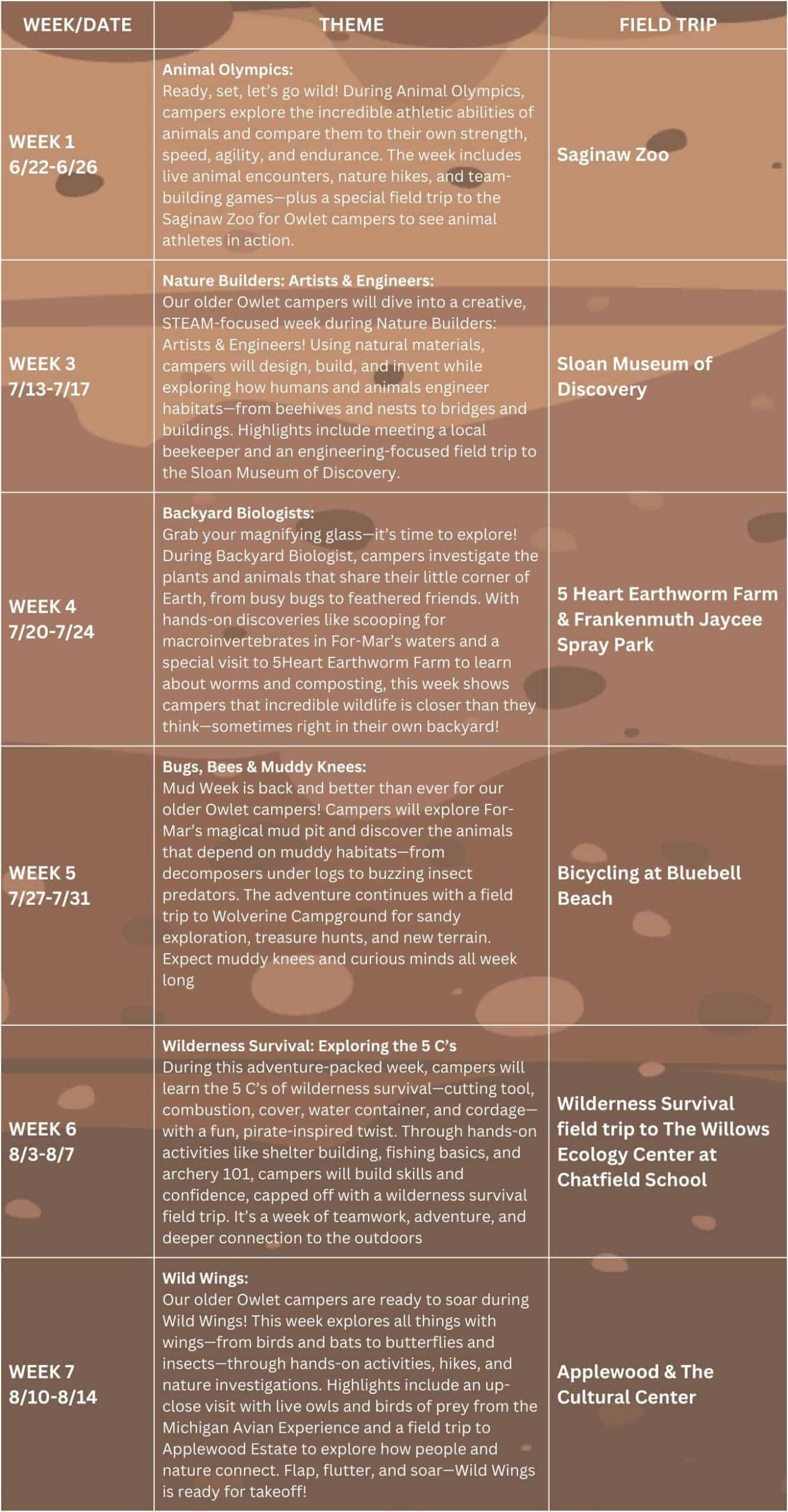 Bring a sack lunch for Owlets, Eagles, Adventure Weeks & CIT campers.